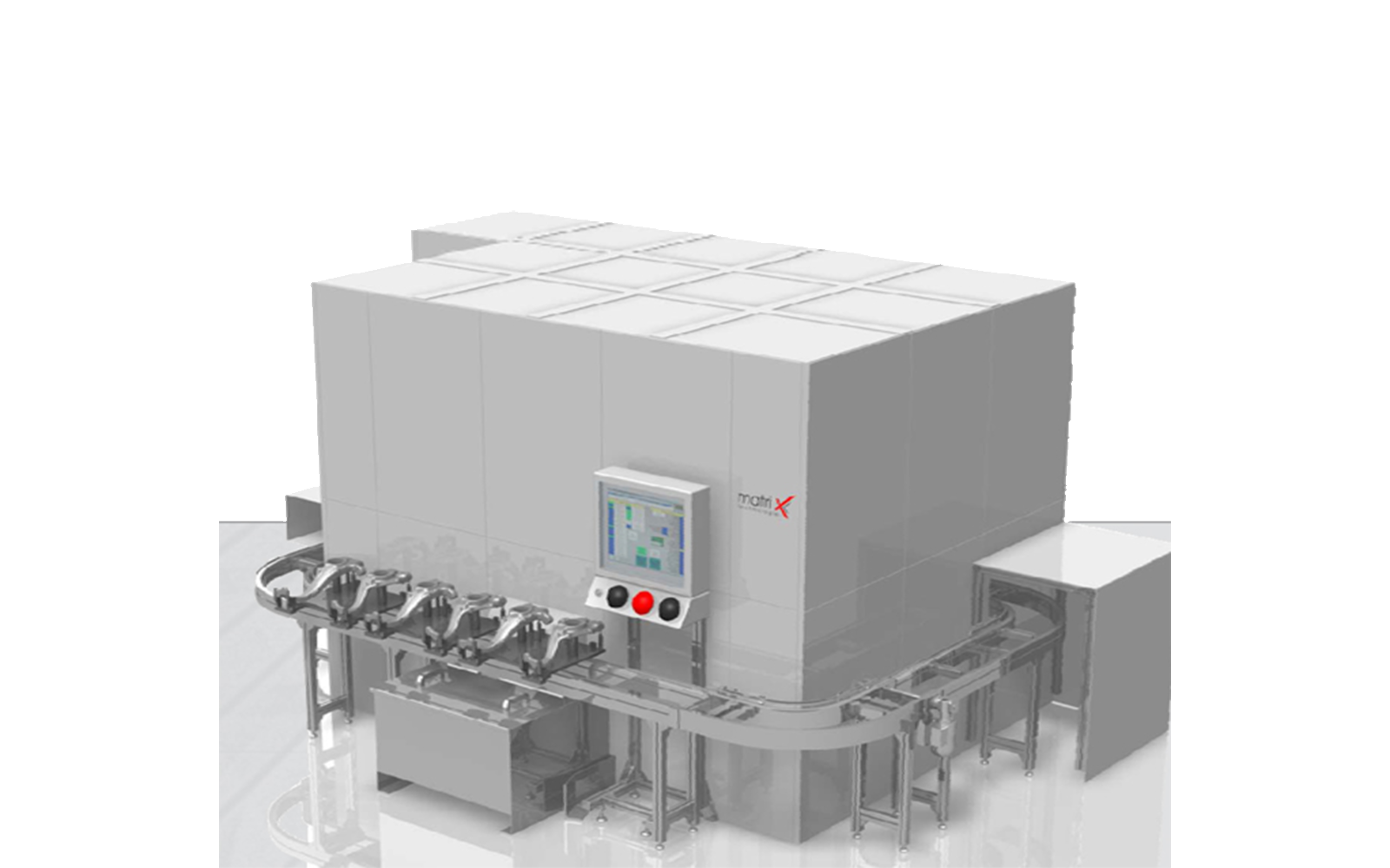The XT-1600 is a fully automatic X-ray inspection system designed for the inspection of big, safety relevant parts in the sectors automotive, aerospace and power generation. Main application is the blowhole detection in castings. The XT-1600 uses a customer specified conveyor system with work piece holders for the transportation of the test samples. To optimize the cycle time, two robots operate in turns manipulating the parts.